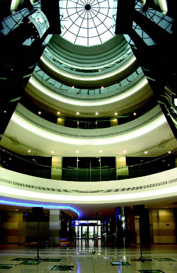 The design features a sinuous blue-glass façade wrapped in crisp white panel framing, evoking a dynamic, high-tech presence. A central vertical glass atrium punctuates the curved volumes, highlighting internal circulation and transparency. A dramatic cantilevered roof canopy sweeps upward, defining the building’s skyline silhouette. Horizontal louvered sunshades and a recessed ground-level colonnade establish a rhythmic scale and balance between solidity and lightness.