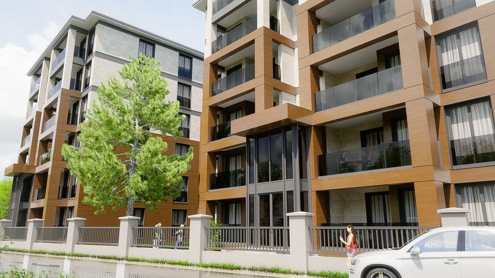Organized as three staggered volumes articulated by warm wood-toned cladding and cool stone panels, the design celebrates material contrast within a cohesive palette. Deep recessed balconies with frameless glass balustrades and expansive floor-to-ceiling glazing foster generous daylighting and private outdoor living for each residence. A low perimeter fence and lush planting establish a human-scaled transition to the surrounding landscape. The rhythmic interplay of horizontal frames and transparent surfaces yields a refined, contemporary residential aesthetic.